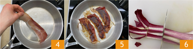 Na mesma frigideira coloque as fatias de speck 4 e frite em fogo médio por uns dez minutos, ou até ficarem bem crocantes 5. Enquanto isso, corte o radicchio em pedaços com cerca de 5 cm de comprimento 6.