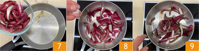 Sempre na mesma frigideira aqueça um fio de óleo e junte o radicchio 7. Salgue 8 e salteie o radicchio na frigideira por cerca de um minuto 9; ele deve permanecer crocante.