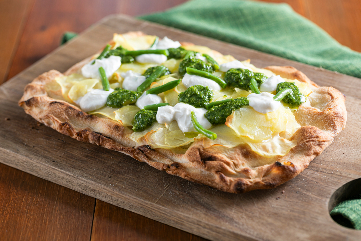A pinsa genovesa é inspirada nos sabores típicos da Ligúria e nos ingredientes que caracterizam um prato símbolo da sua cozinha: as Trenette ao pesto, batatas e vagens. Neste caso, a massa é substituída pela base para pinsa, crocante por fora e macia por dentro, pronta para ser coberta com fatias finas de batata, Pesto alla Genovese caseiro e vagens. Além disso, o toque fresco e cremoso da prescinseua, um queijo local de sabor delicadamente acidulado, deve ser adicionado obrigatoriamente após o cozimento.