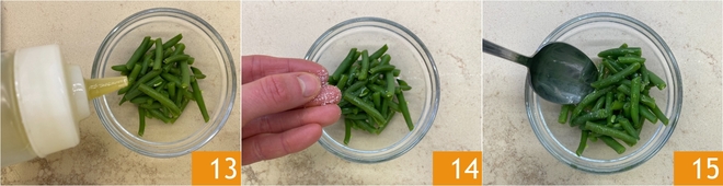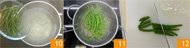 Por fim, cuide das vagens: escalde-as em água salgada por 4-5 minutos 10, depois escorra 11 e deixe esfriar. Corte as vagens em pedaços 12 e transfira para uma tigela.