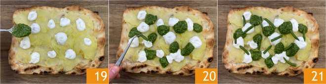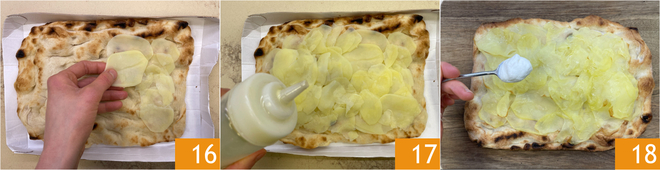 Agora pegue a base para pinsa e disponha as fatias de batata sobre a superfície, sobrepondo-as levemente 16, tempere com um fio de azeite 17 e asse em forno ventilado pré-aquecido a 250° por 5 minutos. Passado esse tempo, retire do forno e acrescente colheradas de prescinseua 18.