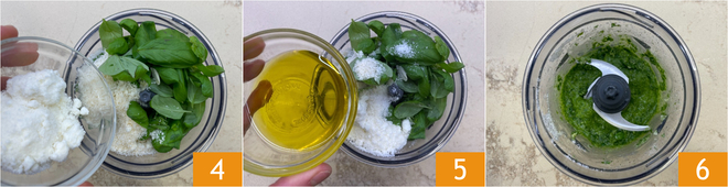 Adicione o Parmigiano Reggiano e o pecorino ralados 4, depois acrescente o azeite 5 e o sal. Bata em pulsos pelo menor tempo possível, apenas o suficiente para obter uma mistura homogênea 6. Reserve.