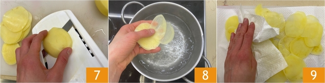 Passe para as batatas: descasque-as e fatie-as com um mandoline para obter uma espessura de cerca de dois milímetros 7. Escalde as fatias de batata em água salgada por aproximadamente 2 minutos 8, depois escorra sobre papel absorvente e seque-as bem 9.