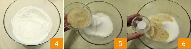 Agora ocupe-se da massa dos pisarei: peneire a farinha em uma tigela 4, depois adicione o pão ralado 5 e o sal 6.