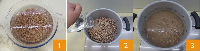 Para preparar os pisarei e fasò, comece pelos feijões borlotti, coloque-os em uma tigela grande cheia de água e deixe-os de molho por 12 horas ou uma noite, cobertos com filme plástico 1. Após o tempo de molho, escorra-os e enxágue-os em água corrente, depois despeje-os em uma panela e cubra-os com água 2 e cozinhe por 30 minutos 3; este tempo será suficiente, pois a cozedura dos feijões continuará depois com o molho.