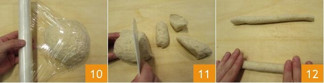 e envolva-o no filme plástico 10. Deixe a massa descansar em um local fresco por 1 hora (fora da geladeira está bem). Após o tempo de descanso, volte a massa, divida-a em pequenas porções 11, e dessas faça tiras com cerca de 1 cm de diâmetro 12.