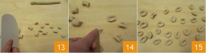 Corte as tiras de massa em pedaços do tamanho de um feijão 13. Com o polegar, pressione cada nhoque para criar uma cavidade interna 14. Os pisarei estão prontos 15; você pode distribuí-los em uma bandeja forrada com um pano de cozinha limpo e seco, levemente enfarinhado. Não há necessidade de cobri-los, mesmo que sequem não será um problema.