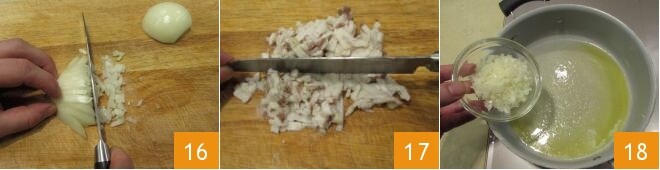 Agora ocupe-se do molho: descasque e pique finamente a cebola 16, pique também o toucinho 17. Depois, em uma panela, derreta a manteiga em fogo baixo e refogue a cebola 18,