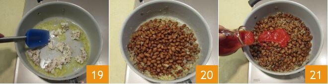 depois adicione o toucinho picado 19, misture para dar sabor e, quando a cebola estiver amolecida, adicione também os feijões previamente cozidos e bem escorridos 20, cubra-os com o purê de tomate 21 e continue a cozedura do molho por cerca de 20 minutos. Você pode ajustar o sal e adicionar água quente (ou caldo de legumes) se necessário, para que o molho não fique muito espesso.