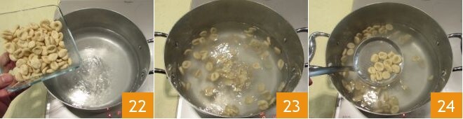 Quando os feijões estiverem cozidos, leve a água para ferver em uma panela grande, adicione sal a gosto e mergulhe os pisarei 22 e cozinhe-os por poucos minutos, até que subam à superfície 23; depois escorra-os com uma escumadeira 24
