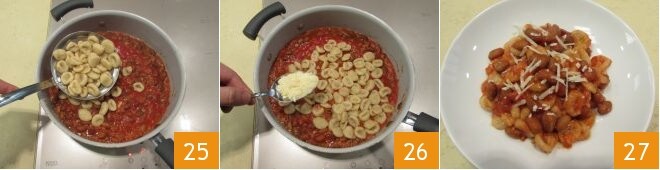 diretamente na panela com os feijões 25, tempere com o Grana Padano ralado 26 e sirva os pisarei e fasò bem quentes com algumas lascas de Grana ainda a gosto 27!