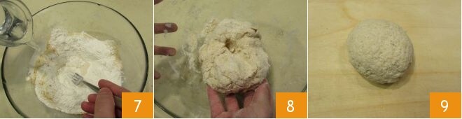 Despeje a água morna em fio 7 e amasse energicamente para misturar os ingredientes 8, formando um pão compacto 9
