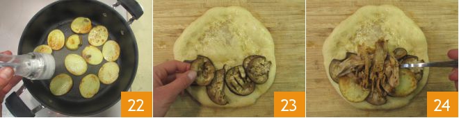 Quando as batatas estiverem douradas, desligue o fogo e salgue 22. O recheio está pronto, pegue uma pita, recheie com ¼ da dose de cada ingrediente começando com as berinjelas 23 e as tiras de cordeiro 24.