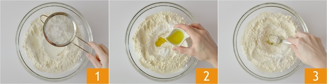 Para preparar a pizza com bicarbonato, peneire a farinha e o bicarbonato em uma tigela grande 1, depois adicione o óleo 2 e comece a misturar 3.