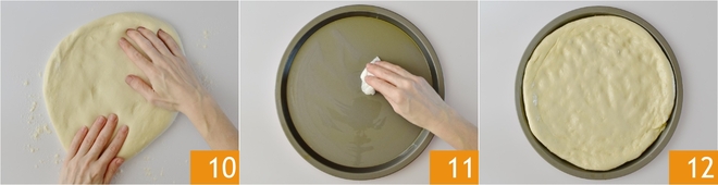 Após o tempo de descanso, pegue a massa e abra-a delicadamente com as mãos até formar um disco com cerca de 26 cm de diâmetro 10. Unte uma assadeira do mesmo tamanho 11 e coloque a massa por cima 12.
