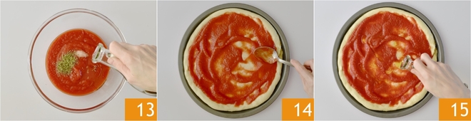 Agora misture em uma tigela 300 g de molho de tomate com sal, óleo e orégano 13. Distribua o molho de tomate sobre a pizza 14 e tempere com mais um fio de óleo 15. Asse a base em forno estático pré-aquecido a 190° por 10 minutos.