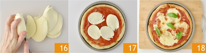 Enquanto isso, corte a mussarela fiordilatte em fatias 16. Retire a base do forno e adicione a mussarela 17, depois leve ao forno novamente por 10-15 minutos ou até que o queijo derreta. Uma vez pronta, decore com manjericão fresco e sirva imediatamente sua pizza com bicarbonato 18!