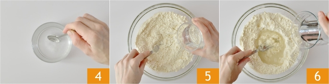 Dissolva o sal em um pouco de água retirada da quantidade total 4, depois despeje a mistura na tigela 5 e continue a misturar, adicionando gradualmente o restante da água 6.
