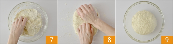 Sove a mistura com as mãos até que a farinha tenha absorvido toda a água 7, depois transfira para a superfície de trabalho levemente enfarinhada e continue a trabalhar por 10-12 minutos 8; você deve obter uma massa lisa e homogênea. Coloque a massa em uma tigela untada com óleo 9, cubra com um pano e deixe descansar à temperatura ambiente por uma hora.