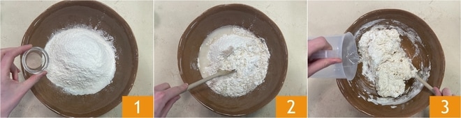 Para preparar a pizza com borda recheada de pesto e ricota, coloque em uma tigela a farinha e o fermento seco 1. Adicione a água em temperatura ambiente aos poucos, mexendo com uma colher 2, até que a farinha absorva todo o líquido 3.