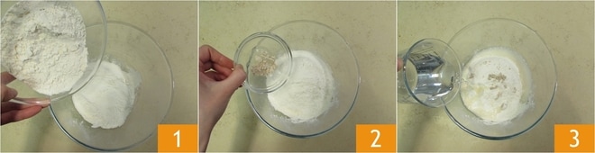 Para preparar a pizza com tomatinhos amarelos, anchovas e alcaparras, comece pela massa. Despeje em uma tigela as farinhas 1 e o fermento esfarelado 2. Adicione a água aos poucos 3,