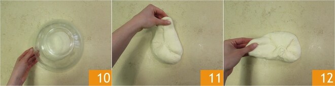 Neste ponto, cubra com a tigela limpa e deixe descansar na bancada por cerca de dez minutos 10. Passado esse tempo, faça uma dobra. Imagine que a esfera está dividida em 4 partes, pegue a extremidade de cada uma, puxe delicadamente 11 e dobre em direção ao centro 12.