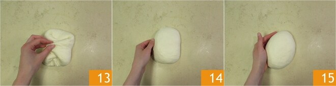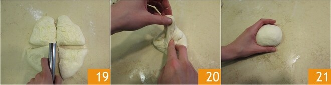 e divida em 4 porções de cerca de 200 g cada 19. Como feito antes, traga as extremidades da massa para o centro 20 e dê uma forma esférica a cada bolinha 21.