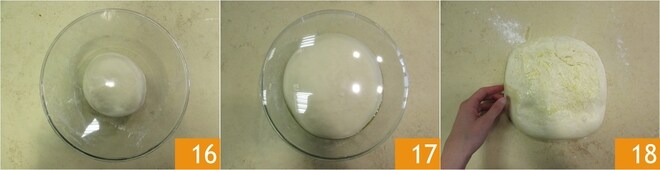 Transfira a massa assim formada para uma tigela untada com óleo, cubra com filme plástico 16 e deixe fermentar até dobrar de volume, levará cerca de 2 horas em temperatura ambiente 17. Passado o tempo de fermentação, a massa estará bem crescida, então transfira-a para a bancada levemente enfarinhada 18
