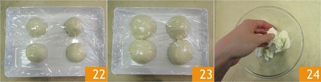 À medida que for formando, transfira-as para uma bandeja untada, depois cubra com filme plástico 22 e deixe fermentar por 30 minutos 23. Enquanto isso, posicione a pedra refratária na parte superior do forno e aqueça-a a 250° em modo ventilado. Rasgue a mussarela com as mãos 24 e conserve na geladeira.
