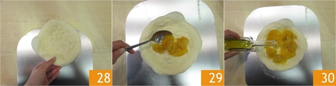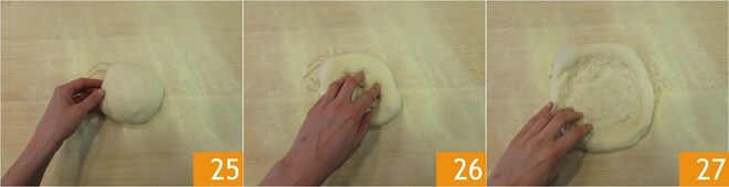 Quando as bolinhas estiverem prontas, pegue a primeira, transfira-a para uma superfície enfarinhada 25 e achate-a começando do centro, com as pontas dos dedos 26. Alargue-a delicadamente para deixar a parte externa mais espessa 27, para que no cozimento se forme a borda.