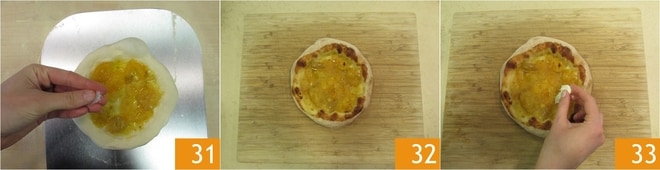 e sal. Asse e deixe cozinhar por cerca de dez minutos. Retire a pizza com a pá e transfira para uma tábua 32, tempere com a mussarela rasgada 33,