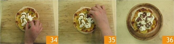 as alcaparras 34 e as anchovas escorridas do óleo 35. Proceda da mesma forma com as outras pizzas e aproveite 36.