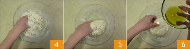 enquanto amassa com as mãos 4. Quando você tiver adicionado toda a água e a massa começar a tomar forma 5, despeje o óleo em fio 6,