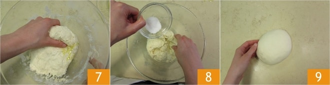 continuando sempre a amassar 7. Quando começar a ser absorvido, adicione o sal 8 e continue a amassar até que a massa fique lisa e homogênea, depois transfira-a para a bancada e trabalhe por mais alguns minutos 9.
