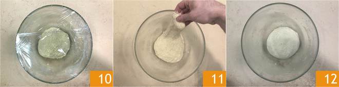 Cubra a massa com filme plástico 10 ou com um pano e deixe repousar por 10 minutos em temperatura ambiente. Passados os 10 minutos, na mesma tigela faça as primeiras dobras na massa, levantando-a pelas laterais 11 e levando-a para o centro, depois deixe descansar por mais 10 minutos em temperatura ambiente. Repita essa operação um total de 4 vezes. Na última vez, deixe sua massa crescer em uma tigela em temperatura ambiente 12, coberta com filme plástico, por cerca de 2 horas.