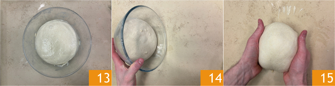 Retome a massa fermentada 13. Vire-a sobre uma superfície de trabalho 14 ou balcão levemente untado com azeite e faça as últimas dobras 15.