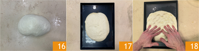 Modele um pão com formato alongado 16. Em uma assadeira de forno de 30x40 cm, levemente untada, coloque a massa 17 e deixe dobrar de volume; levará cerca de 30 minutos. Assim que estiver pronta, abra a massa espalhando-a com as pontas dos dedos 17.