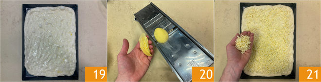 Deixe as bordas altas 19. A seguir você pode passar ao preparo das batatas, cortando-as em fatias de 2 mm com uma mandolina 20. É o momento de temperar a pizza com a mussarela em tirinhas 21, distribuindo-a de forma uniforme sobre a superfície 21.