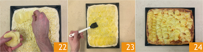 Coloque por cima as batatas cortadas anteriormente 22 e pincele a superfície com azeite 23. Asse por 30 minutos a 250° em forno estático. Retire do forno quando as batatas estiverem douradas 24 e sirva a pizza de batata bem quente!