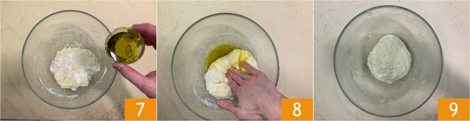 Acrescente também o azeite 7 e trabalhe energicamente 8 até a completa absorção dos dois ingredientes 9.