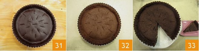 e use uma faca para fazer cortes na superfície da torta 31, que ajudarão a liberar a umidade. Asse a pizza doce de cacau em forno estático pré-aquecido a 180° por 40 minutos (se usar forno ventilado, pré-aqueça a 160° e asse por cerca de 30-35 minutos, dependendo da potência do seu forno). Uma vez assada, retire sua pizza doce de cacau do forno 32 e deixe esfriar antes de saborear 33.
