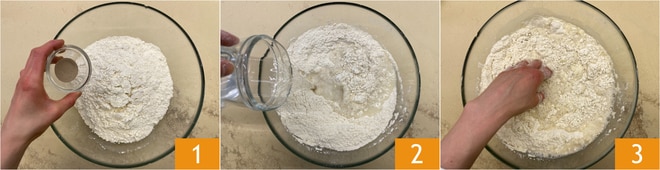 Para preparar a pizza frita com escarola, primeiro coloque a farinha em uma tigela grande, adicione o fermento 1 e misture rapidamente com as mãos. Despeje uma parte da água 2 e sove 3 até que seja absorvida pela farinha. Em seguida, continue despejando a água aos poucos até obter uma massa homogênea.