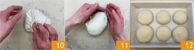 Pegue cada uma dessas partes e puxe as extremidades de fora para o centro 10, então boleie para formar bolinhas 11. Coloque as bolinhas em uma caixa para fermentação, feche com uma tampa e deixe fermentar por 6-8 horas a uma temperatura de cerca de 18°-24° 12.