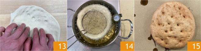Passado o tempo de fermentação, abra as bolas de massa na superfície de trabalho levemente enfarinhada, apertando-as levemente com as pontas dos dedos e tocando o mínimo possível; você deve formar um disco com cerca de 22 cm de diâmetro 13. Frite-os em óleo de sementes a 180° 14; para uma cocção uniforme, despeje o óleo quente sobre a superfície da pizza com a ajuda de uma concha. Frite por cerca de 5-7 minutos, virando na metade do tempo de cocção. À medida que forem ficando prontas, transfira as pizzas fritas para papel absorvente para eliminar o excesso de óleo 15.
