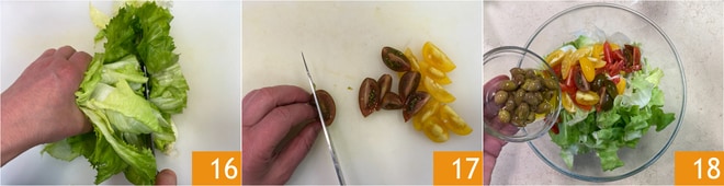 Enquanto isso, prepare o recheio: corte a escarola crespa em pedaços 16 e os tomatinhos em quartos 17. Coloque-os em uma tigela e adicione as azeitonas 18.