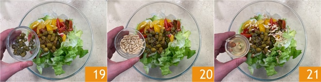 Adicione as alcaparras 19, os pinhões 20 e a colatura de anchovas 21.