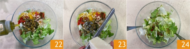 Despeje o azeite 22, adicione o pecorino ralado 23 e misture tudo 24.
