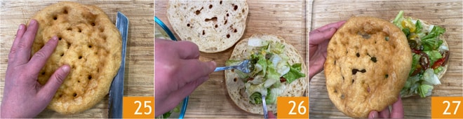 Corte as pizzas ao meio 25 e recheie com o recheio 26. Por último, coloque as pizzas recheadas no forno a 200° por 4-5 minutos. Sua pizza frita com escarola está pronta para ser saboreada 27!