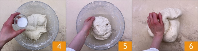 Adicione o sal 4 e continue sovando para incorporá-lo 5. Mova-se para a superfície de trabalho e trabalhe a massa por cerca de 20 minutos 6, até que fique lisa e homogênea.