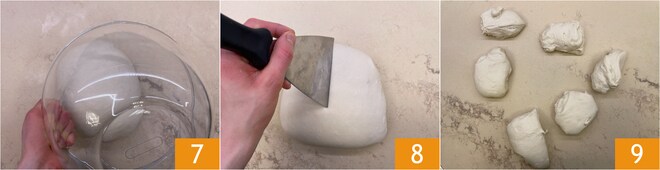 Cubra a bola de massa com a tigela 7 e deixe descansar na superfície de trabalho por 15 a 40 minutos. Neste ponto, divida a massa em 6 partes de 280 g cada 8 9.